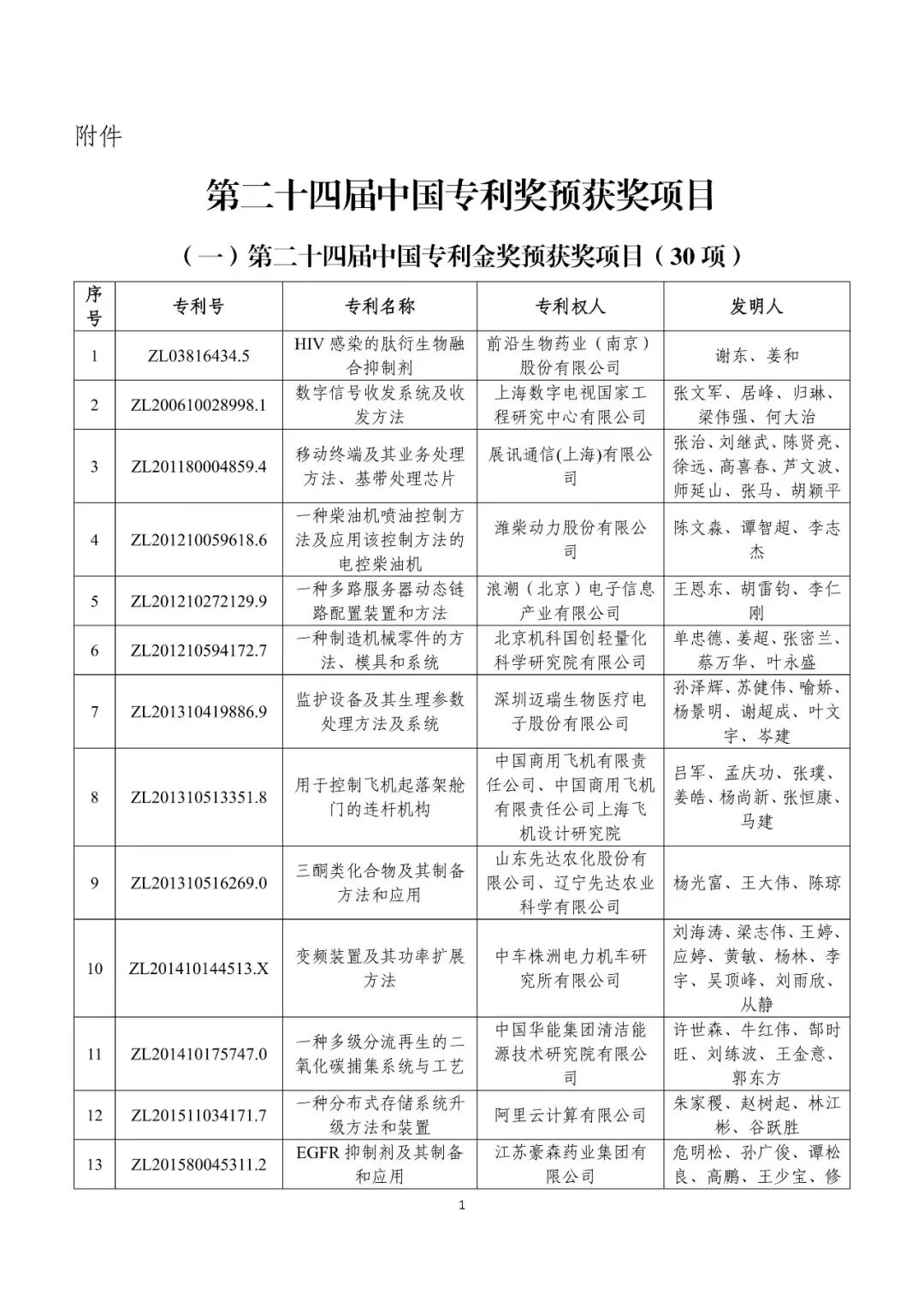 国家知识产权局在官网发布通知,根据《中国专利奖评奖办法》《国家知识产权局关于评选第二十四届中国专利奖的通知》规定,第二十四届中国专利奖共评选出中国专利金奖预获奖项目30项,中国外观设计金奖预获奖项目10项,中国专利银奖预获奖项目60项,中国外观设计银奖预获奖项目15项,中国专利优秀奖预获奖项目782项,中国外观设计优秀奖预获奖项目45项,现予以公示,公示期为2023年4月17日至4月21日。以下为金银奖项目——