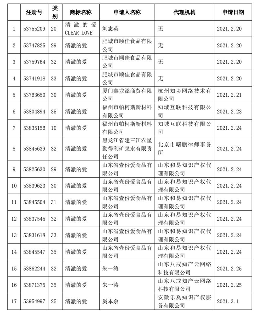 更新时间:2021-03-16 浏览次数:525次2021年2月19日,中央军委为戍边烈士陈祥榕追记一等功。“清澈的爱,只为中国”是陈祥榕烈士生前写下的战斗口号,充分彰显新时代英烈对祖国的热爱和无私奉献的高尚情操。2月20日以来,“清澈的爱”被个别企业和自然人当做商标向国家知识产权局商标局提交了注册申请,图谋不当利益,代理机构提供不法服务,亵渎了英烈的精神,背离了社会主义核心价值观,极易产生恶劣的社会影响。对此,国家知识产权局予以谴责,并依据商标法第十条第一款第八项“有害于社会主义道德风尚或者有其他不良影响的”的规定,快速果断地对第53747825号“清澈的爱”等17件商标注册申请作出驳回决定。现予以公布。
