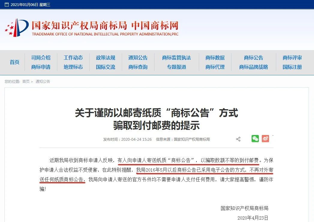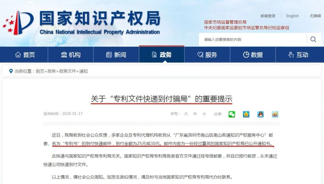 “近日,我局收到社会公众反馈,多家企业及专利代理机构收到从“广东省深圳市南山区南山街道知识产权服务中心”邮寄、名为“专利书”的到付快递邮件,到付金额为25元或30元。邮件内容为一份经过篡改的国家知识产权局已公开通知书。 此快递与国家知识产权局专利局无关。国家知识产权局专利局各类官方文件通过挂号信邮寄,并且已预付邮资,从未通过快递公司快递到付文件。 以上情况,请社会公众周知。如发生类似情况,请及时与当地国家知识产权局专利局代办处联系。”