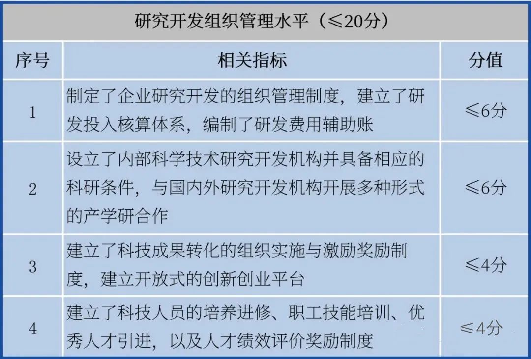 其中,发明专利(含国防专利)、植物新品种、国家级农作物品种、国家新药、国家一级中药保护品种、集成电路布图设计专有权等按Ⅰ类评价,是高新技术企业认定的首要条件,在高企认定中会给申请人带来相应较高的分数,因此企业必须尽早获取核心自主知识产权。1.在前期设立研发立项,就应当将知识产权提前布局和规划,避免存在申报当年或上年度集中授权情况。且建议企业每年申请知识产权5项以上,保证企业自身每年均有5件以上科技成果,从而体现出企业持续研发、持续创新能力。2.企业在申请软件著作权时,要注意软件开发完成时间应在研发立项实施阶段。建议企业申请知识产权时,开发完成时间与研发立项周期密切贴合。3.企业申请的知识产权名称和研发立项名称关联度不高时,建议企业申请知识产权时体现出其核心技术点,以方便评审专家一眼就可分辨。高新技术企业认定工作指引中明确了研发费用归集的范围:人员人工费用、直接投入费用、折旧费用与长期待摊费用、无形资产摊销费用、设计费用、装备调试费用与试验费用、委托外部研究开发费用以及其他费用。企业一定要提前按照指引要求,对研发费用逐项进行归集和认定。如果没有进行提前规划,在高企认定之前才临时按项目对研发费用逐项整理,不但工作量非常大,还经常会出现纰漏,导致高企认定失败。建议:建议企业提前拟定研发项目及周期,并在每年汇算清缴时申报加计扣除。高新技术企业认定条件中明确规定科技人员要占企业当年职工总数比例不低于10%,这就要求企业提前建立合理的人力资源体系。企业应当对人力资源进行专业系统的规划,建立健全的人力资源体系,以此满足公司和员工发展的需求。建议:申报材料内的职工总数与当年企业所得税年度纳税申报基础信息表中(104从业人数)差异不超过10人。如低于10人建议出具相关的差异说明并附在人力资源情况表处,超过10人,建议更正当年企业所得税年度纳税申报基础信息表中(104从业人数)。科技成果是指通过科学研究与技术开发所产生的具有实用价值的成果。(专利、版权、集成电路布图设计等)。科技成果转化是指为提高生产力水平而对科技成果进行的后续试验、开发、应用、推广直至形成新产品、新工艺、新材料,发展新产业等活动。科技成果转化,是高新技术企业评审认定条件中另一项高分项,分值高达30分,对高企认定的成功率影响很大。1.科技成果转化逐项说明中应贴合产品进行具体描述,具体描述但不限于:该成果对产品产生了具体的作用或工艺手法、利用该成果实现了某些具体的指标和经济效应等。2.每个主要产品建议都补充检测报告/查新报告。加以佐证企业自身科技成果转化实施能力和企业产品技术的先进性。高企认定工作指引指出创新能力评价体系中研究开发组织管理水平评分占20分,这就要求企业在日常研发过程中对研发流程的梳理、管理制度的执行、奖励政策的体现都要明确规范。因此,但凡能证明企业实际进行了研发活动并取得一定成果的材料都应要注意日常收集与整理,才不至于临时抱佛脚,资料准备不充分。1.申报企业建立管理制度体系时,根据企业现行的组织架构流程,制定符合具有企业自身特点的研发组织管理体系,发布并实施相关制度流程。2.《研发投入核算制度》、《研发费用辅助帐核算管理办法》等相关制度中规定的会计准则需规范到企业具体的财务归集和研发费用核算的日常工作中,并严格遵守。3.结合企业自身发展变化及经营管理需求,制定并更新迭代相关的组织管理制度并实施发布修订版。4.建立健全的研究开发机构,有条件的可申请认定工程技术研究中心、企业技术中心、工程研究中心等研发平台。企业创新能力主要从知识产权、科技成果转化能力、研究开发组织管理水平、企业成长性等四项指标进行评价:知识产权≦30分由技术专家对企业申报的知识产权是否符合《认定办法》和《工作指引》要求,进行定性与定量结合的评价。依照《促进科技成果转化法》,科技成果是指通过科学研究与技术开发所产生的具有实用价值的成果(专利、版权、集成电路布图设计等)。科技成果转化是指为提高生产力水平而对科技成果进行的后续试验、开发、应用、推广直至形成新产品、新工艺、新材料,发展新产业等活动。科技成果转化形式包括:自行投资实施转化;向他人转让该技术成果;许可他人使用该科技成果;以该科技成果作为合作条件,与他人共同实施转化;以该科技成果作价投资、折算股份或者出资比例;以及其他协商确定的方式。由技术专家根据企业科技成果转化总体情况和近3年内科技成果转化的年平均数进行综合评价。同一科技成果分别在国内外转化的,或转化为多个产品、服务、工艺、样品、样机等的,只计为一项。由技术专家根据企业研究开发与技术创新组织管理的总体情况,结合以下几项评价,进行综合打分。由财务专家选取企业净资产增长率、销售收入增长率等指标对企业成长性进行评价。企业实际经营期不满三年的按实际经营时间计算。计算方法如下:净资产增长率=1/2(第二年末净资产÷第一年末净资产+第三年末净资产÷第二年末净资产)-1资产总额、负债总额应以具有资质的中介机构鉴证的企业会计报表期末数为准。销售收入增长率=1/2(第二年销售收
